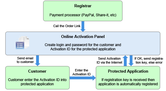 Online Activation Panel is integrating into payment processor system. Once the order has came and approved, registrar calls Online Activation Panel. Order is being saved to the database, the new customer record is creating and customer is being notified by email about successful order processing and license information, such as Activation ID. Customer downloads the protected program and runs it. If the program is not yet activated, customer will be asked to enter Activation ID, connect to the internet and activate. While activation, program connects to the Online Activation Panel and checks if the Activation ID exists in the database. If conditions are passed, Online Activation Panel generates a registration name and key based on the hardware equipment of the customer computer and sends this registration information back to program. Program registers and continues to work.